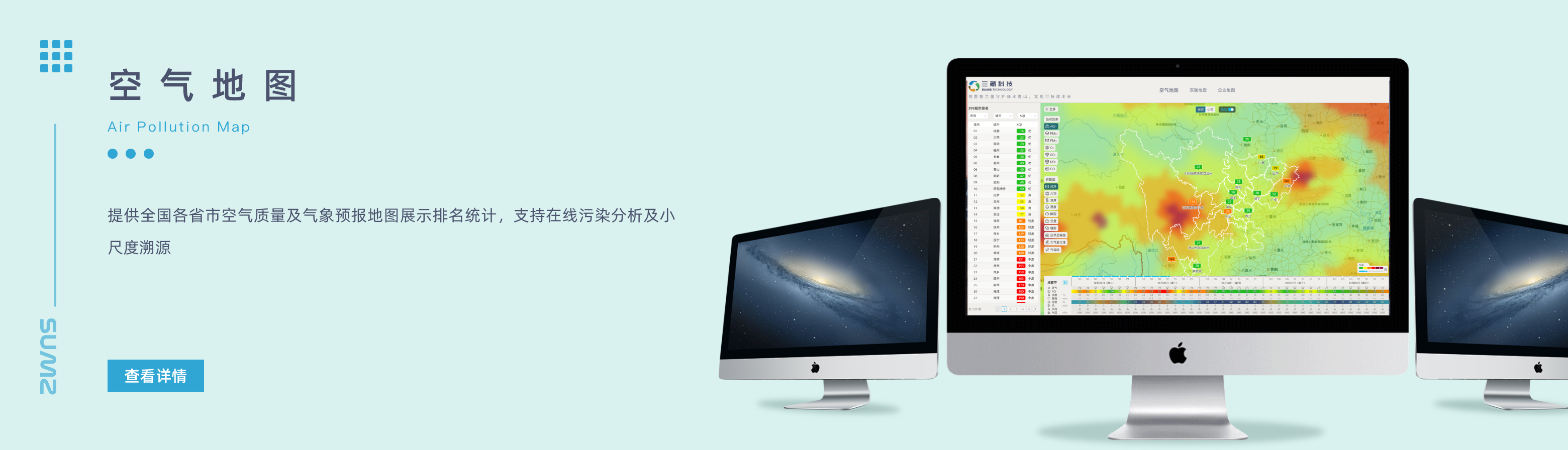 提供全國各省市空氣質(zhì)量及氣象預(yù)報地圖展示排名統(tǒng)計,支持在線污染分析及小尺度溯源
